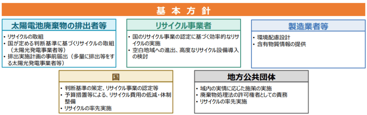 使用済太陽光パネルの排出抑制およびリサイクルを総合的かつ計画的に推進するため、国が各主体の役割やリサイクル目標を定めることとされています。