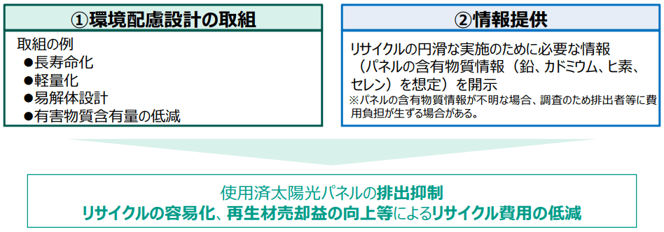 このため、太陽光パネルの製造業者(輸入業者及び販売業者を含む)には、製品の製造段階における環境配慮設計やリサイクルに必要な情報提供が責務として求めることとされています。