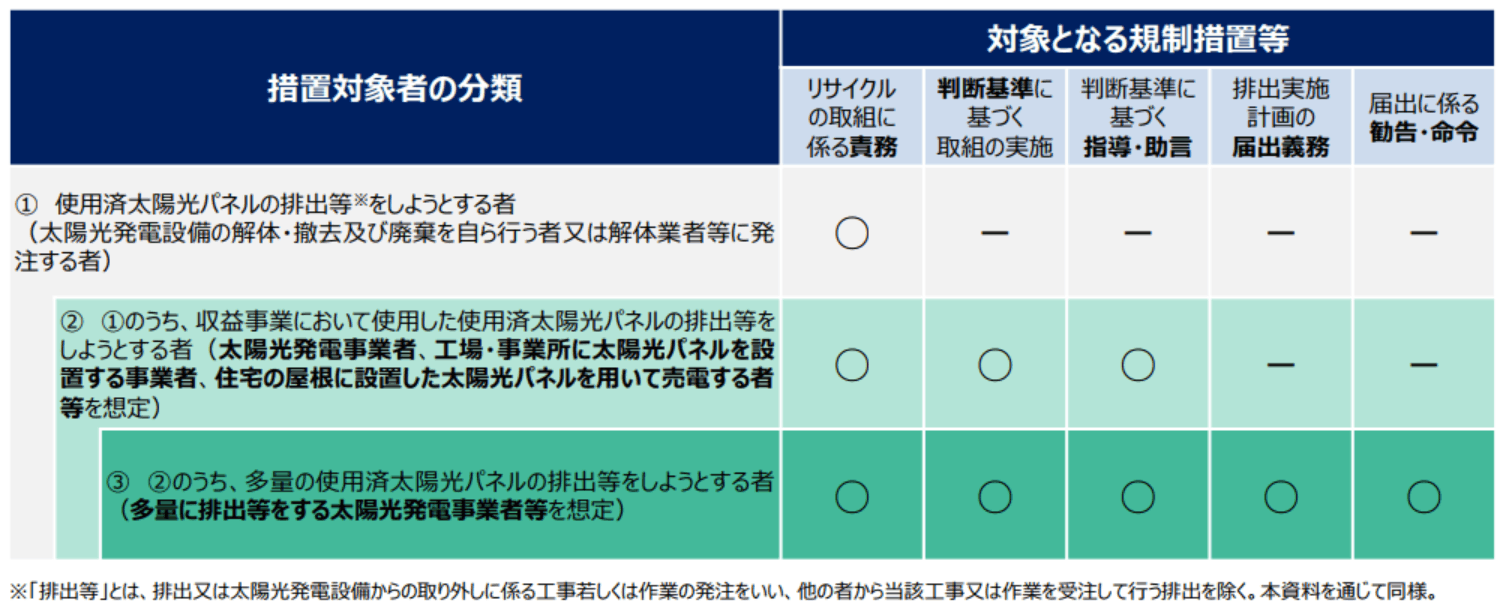 使用済太陽光パネルの排出をしようとする者を『リサイクルの取組の主体』と位置付けた上で、その中でも効率的にリサイクルが実施可能な『多量の使用済太陽光パネルの排出等をしようとする事業者』に対して、リサイクルの取組みを義務付ける方針です。