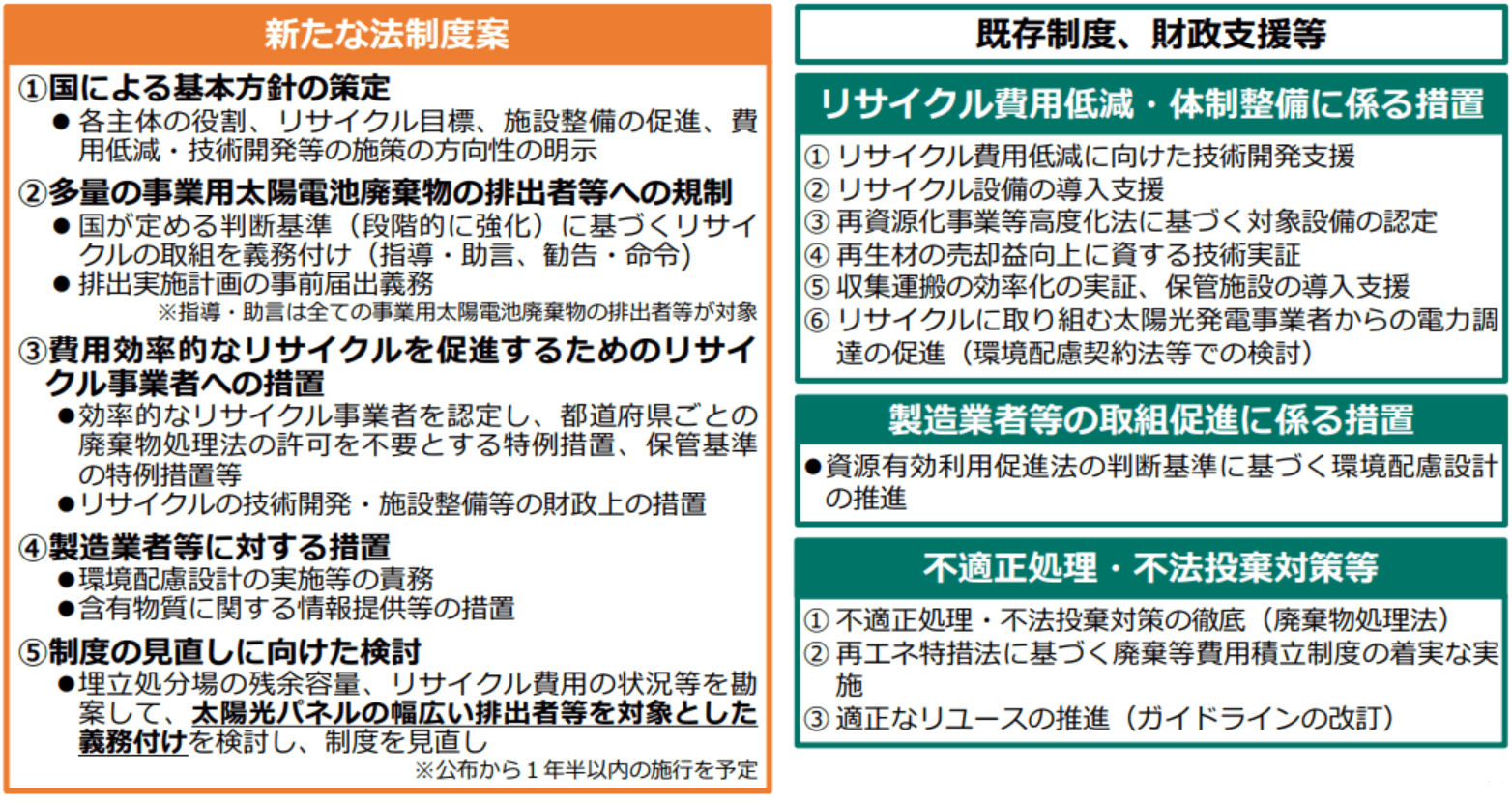 今回新たに示された法制度案では、まず効率的なリサイクルが可能な多量の事業用太陽電池廃棄物の排出者等を対象に規制を導入し、技術開発や設備導入を通じて、リサイクル費用の低減および処理体制の整備を図るとしています。