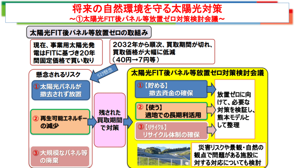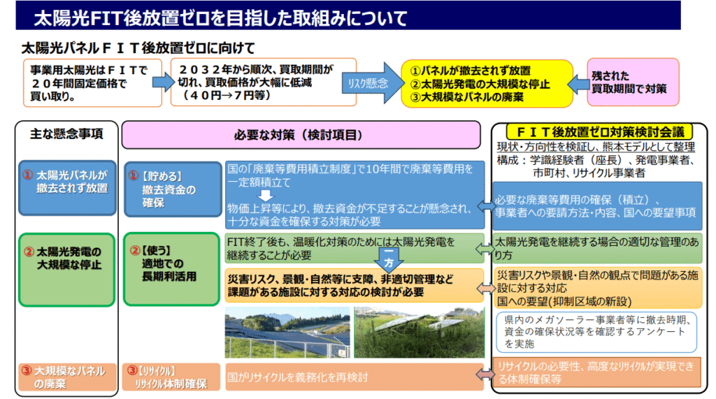 事業用太陽光発電はFIT制度に基づき20年間の固定価格買取が行われていますが、2032年以降、順次FIT期間の終了を迎えることから、太陽光パネルの放置や大規模な廃棄、再生可能エネルギー発電量の減少などが懸念が指摘されています。