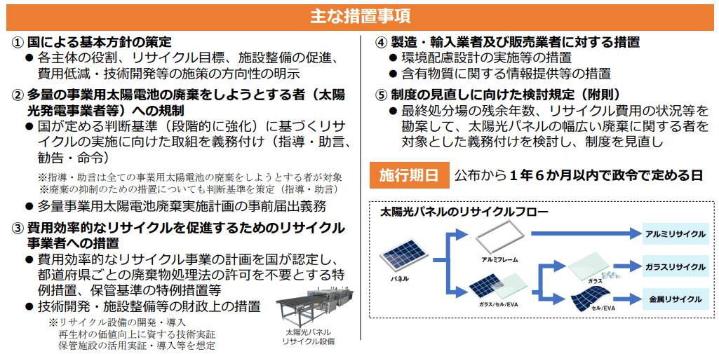 主な措置として5項目が示されており、廃棄を行う事業者への規制に加え、経済合理的なリサイクルを促進するためのリサイクル事業者への支援や、太陽光パネルの製造業者等に対する環境配慮設計・情報提供などの措置が盛り込まれています。