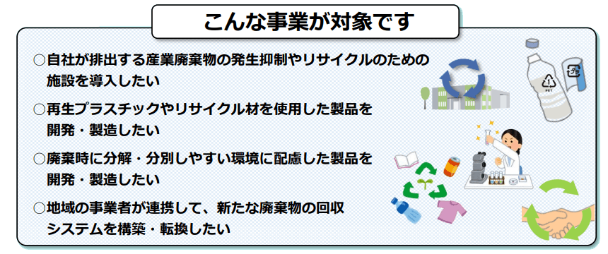 今年度から事業名が「3R取組企業支援事業」から「資源循環取組企業支援事業」に変更されており、処理施設の導入以外にも環境配慮製品の開発や地域での連携事業も対象となっています。